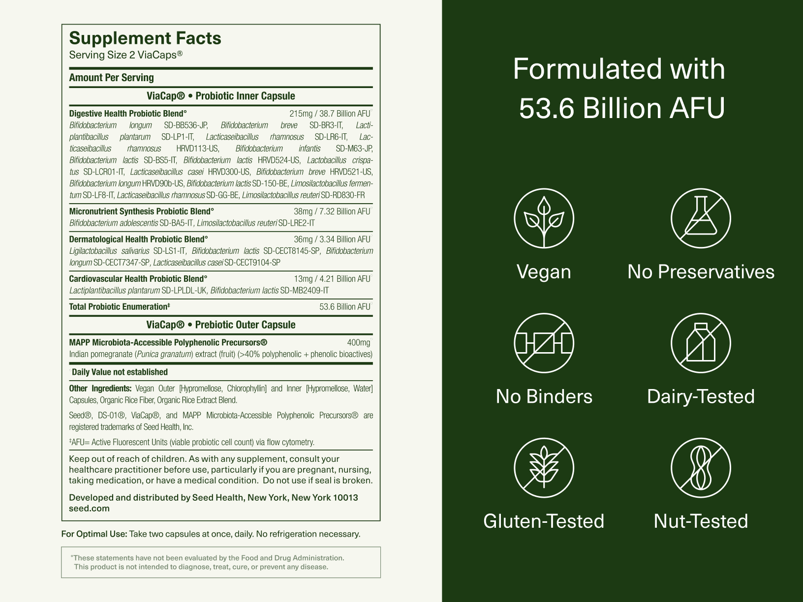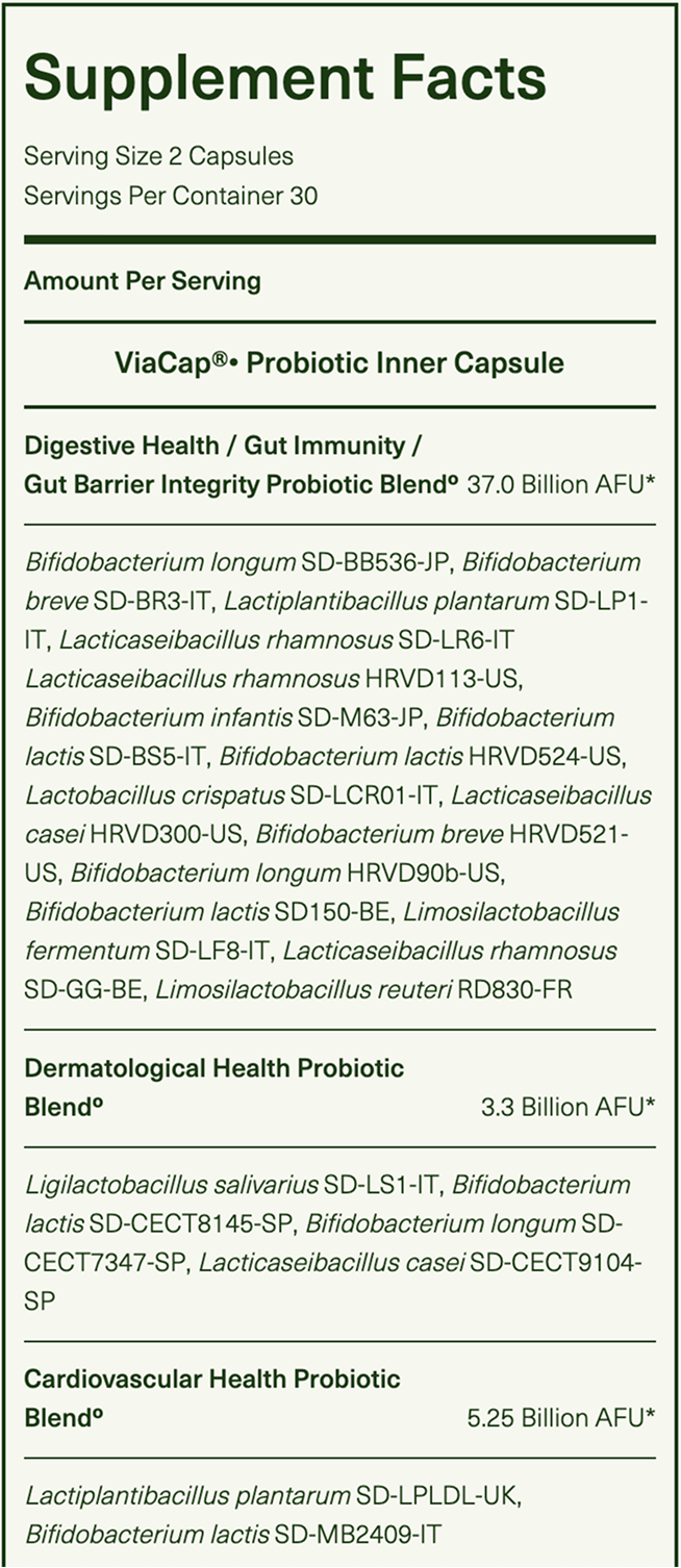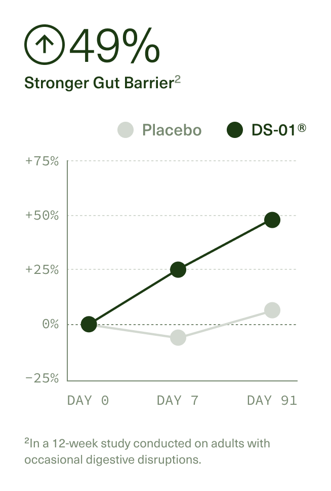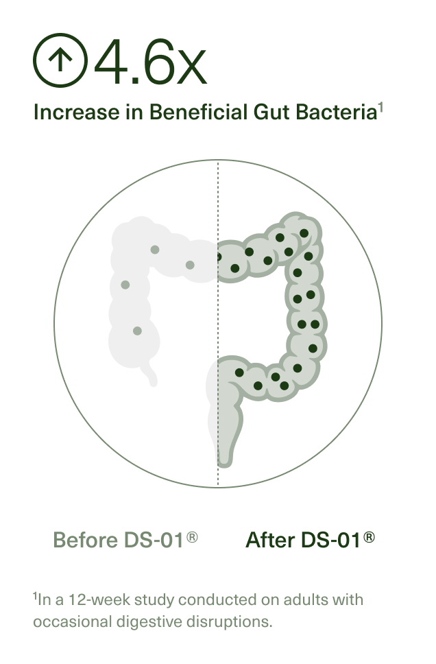 DS-01® contains probiotic strains that have been clinically and scientifically studied to provide benefits around gastrointestinal function, skin health, heart health, gut immune function, gut barrier integrity, and micronutrient synthesis.