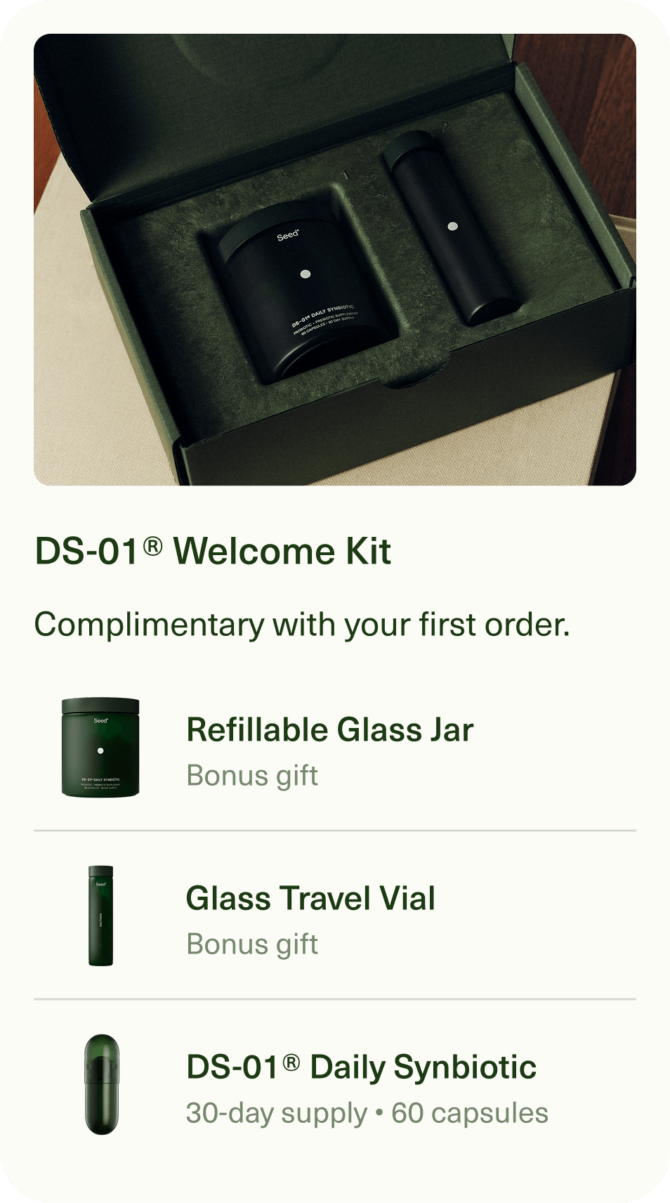 Your monthly subscription includes a 30-day supply of DS-01®. Your first month’s shipment is your Welcome Kit. It includes a reusable glass jar holding your first month’s supply, some Seed reading materials, and a complimentary travel vial that holds a week’s worth of your DS-01®, so you never miss a day on the go.